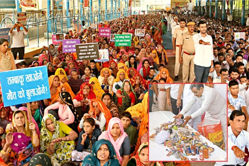 राजस्थान पत्रिका के अजमेर संस्करण के 24वें स्थापना दिवस के कार्यक्रम के तहत राजगढ़ मसाणिया भैरवधाम में नशा मुक्ति की शपथ लेते लोग और लोगों द्वारा छोड़े गए तंबाकू उत्पाद। फोटो: जय माखीजा पत्रिका