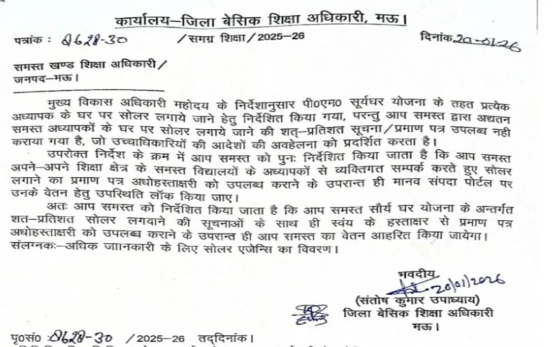 Mau Education News: जनपद मऊ में प्राथमिक विद्यालयों के शिक्षक इन दिनों पढ़ाने से ज़्यादा सरकारी योजनाओं के पालन में उलझते नज़र आ रहे हैं। कुत्ता काटने की घटनाओं में लोगों की मदद पहुंचाने के बाद अब गुरुजनों को एक और नया “अलर्ट कार्य” सौंप दिया गया है। इस बार मामला पीएम सूर्यघर योजना के तहत शिक्षकों के घरों पर सोलर पैनल लगवाने से जुड़ा है, जिसे लेकर प्रशासनिक सख़्ती सामने आई है।