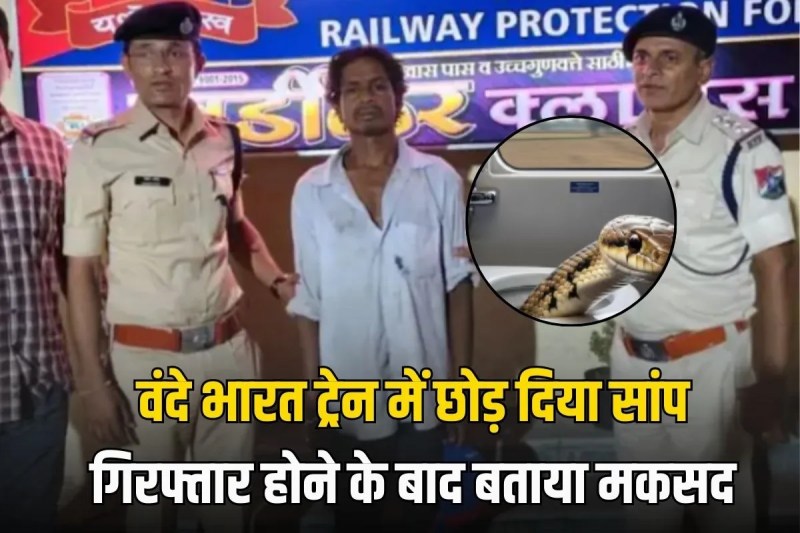 Snake in Vande Bharat: वंदे भारत ट्रेन किसी न किसी वजह से अक्सर सुर्खियों में बनी रहती है। इस बार एक ऐसी घटना सामने आई है, जिसने सभी को हैरान कर दिया। दरअसल, वंदे भारत ट्रेन के टॉयलेट में एक शख्स ने सांप छोड़ दिया। बताया जा रहा है कि यह खबर जैसे ही यात्रियों को पता चली, पूरे कोच में अफरा-तफरी मच गई। फिलहाल इस मामले में सांप रखने वाले आरोपी को पुलिस ने गिरफ्तार कर लिया है।