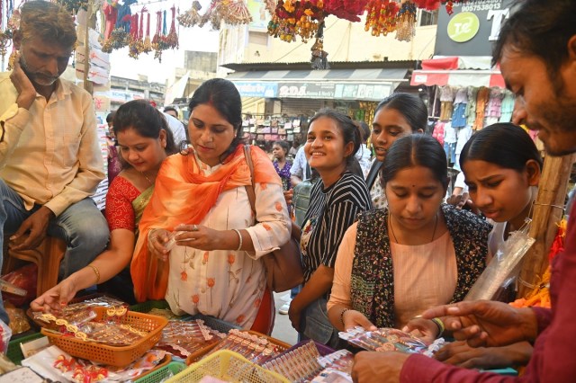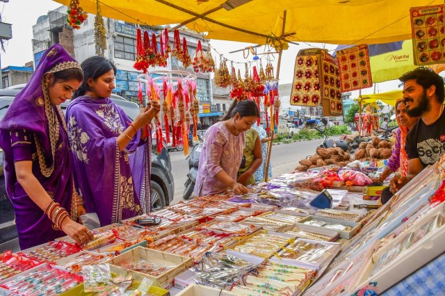 जयपुर में राखियों की एक दुकान पर बहनें राखियां पसंद करते हुए। फोटो— अनुग्रह सोलोमन
