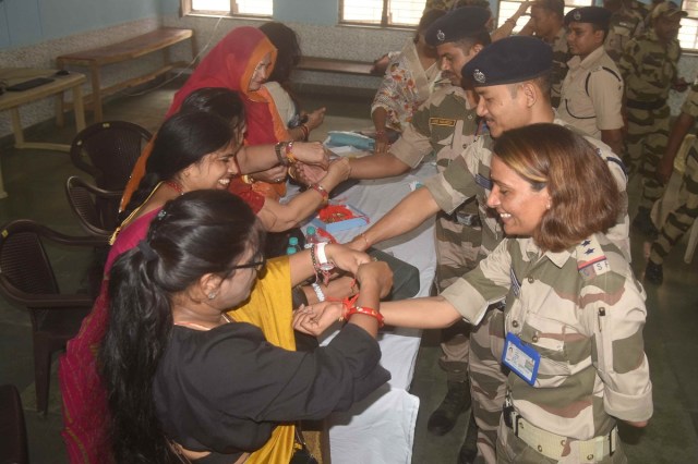 उदयपुर में फौजियों के राखी बांधती हुई महिलाएं। फोटो— प्रमोद सोनी