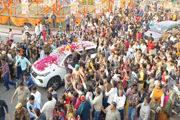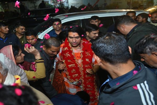 पुष्पवर्षा से धीरेन्द्र शास्त्री  की अगवानी