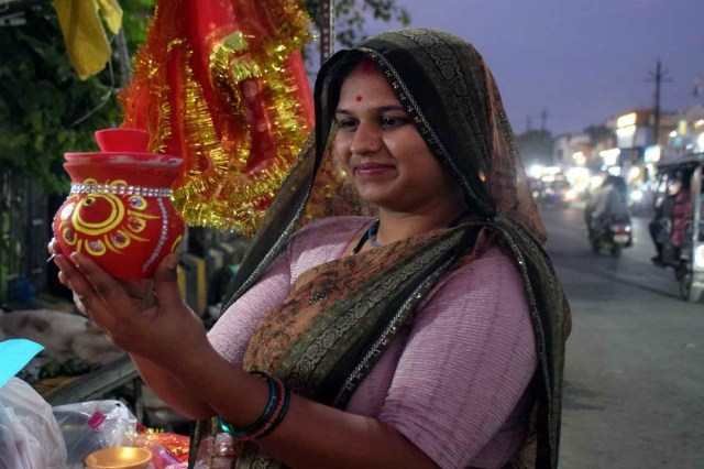 जबलपुर में करवा चौथ की तैयारी के लिए पूजन सामग्री लेते हुए महिला। फोटो— अफरोज खान