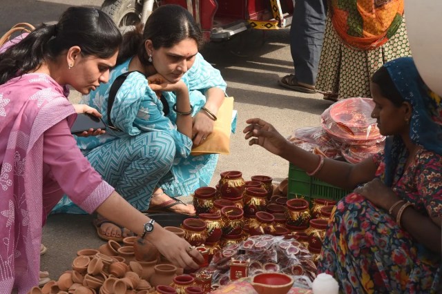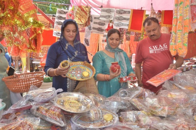 जोधपुर में करवा चौथ व्रत के लिए नयापुरा स्थित दुकान से पूजा की थाली एवं करवा ख़रीदती महिलाएं। फ़ोटो- गौतम उडेलिया