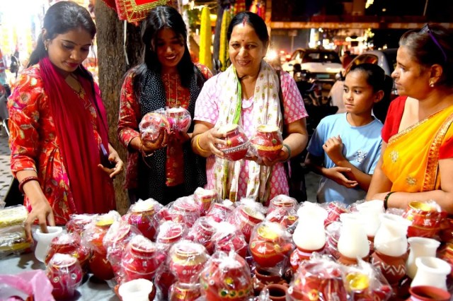 उदयपुर में करवा चौथ पर्व के लिए मधुबन क्षेत्र में लगी स्टालों पर करवा एवं पूजन सामग्री खरीदती महिलाएं। प्रमोद सोनी