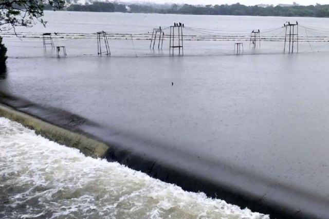 भोपाल में बड़े तालाब का जल स्तर बढ़ा। सड़क और तालाब का पानी ऐसा लग रहा जैसे तालाब का पानी बाहर आ गया हो। फोटो सुभाष ठाकुर