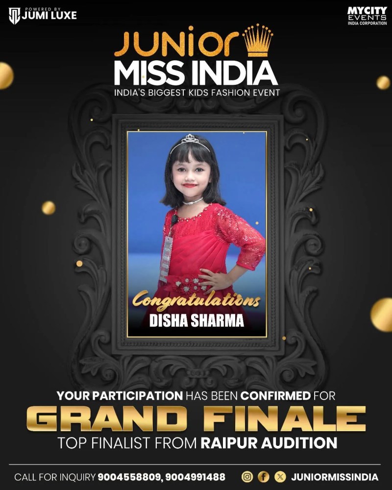 कला के साथ-साथ शिक्षा के क्षेत्र में भी दिशा का प्रदर्शन सराहनीय है और वे अपनी कक्षा में टॉपर रही हैं।Junior Miss India के ग्रैंड फिनाले में दिशा शर्मा की यह उपलब्धि न केवल उनके परिवार बल्कि पूरे रायपुर शहर और छत्तीसगढ़ राज्य के लिए गौरव का विषय है। दिशा आज हजारों बच्चों के लिए प्रेरणास्रोत बनकर सामने आई हैं और यह संदेश देती हैं कि सही मार्गदर्शन और मेहनत से कम उम्र में भी बड़े सपने पूरे किए जा सकते हैं।