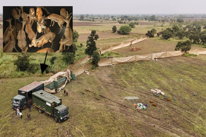 हेलिकाप्टर से विशेषज्ञ उड़ान भर रहे हैं। इसकी सतह से हेलिकॉप्टर की ऊंचाई बहुत कम है। हेलिकॉप्टर को कम ऊंचाई पर एक निश्चित दिशा में उड़ाया जा रहा है। इससे उसकी आवाज से नीलगाय व काले हिरण एक और भागते हैं। इनको जिस ओर हांका जा रहा है। उस ओर पहले से बोमा पद्धति से एक क्षेत्र को कवर्ड किया गया हुआ है। इस तरह कवर्ड क्षेत्र का एक सिरा वन्यप्राणियों को रेस्क्यू करने वाले वाहनों में जाकर खुल रहा है। ऐसे में हेलिकॉप्टर से लगाए जाने वाले हांका से नीलगाय व काले हिरण वाहनों में प्रवेश करने को बाध्य हो जाते हैं। इसके बाद जब ये वाहन में प्रवेश कर लेते हैं इन्हें मंदसौर जिले के गांधीसागर वन्यजीव अभयारण्य में छोड़ा जा रहा है।