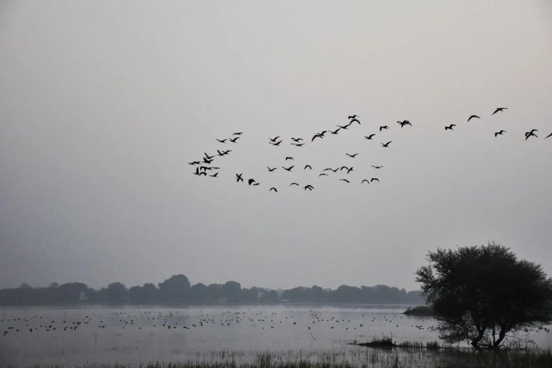 बर्ड विलेज मेनार के धंड तालाब पर उड़ान भरते पक्षी।
